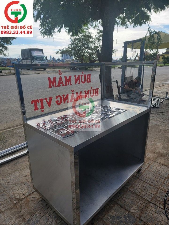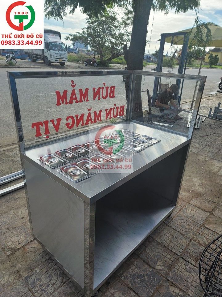 Cần bán tủ bán hàng inox có nhiềuô đựng topping, tình trạng còn mới 97%.